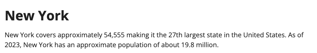 New York has a geographical size of 54,555, making it the 27th largest state with an estimated population size of 19.8 million.
